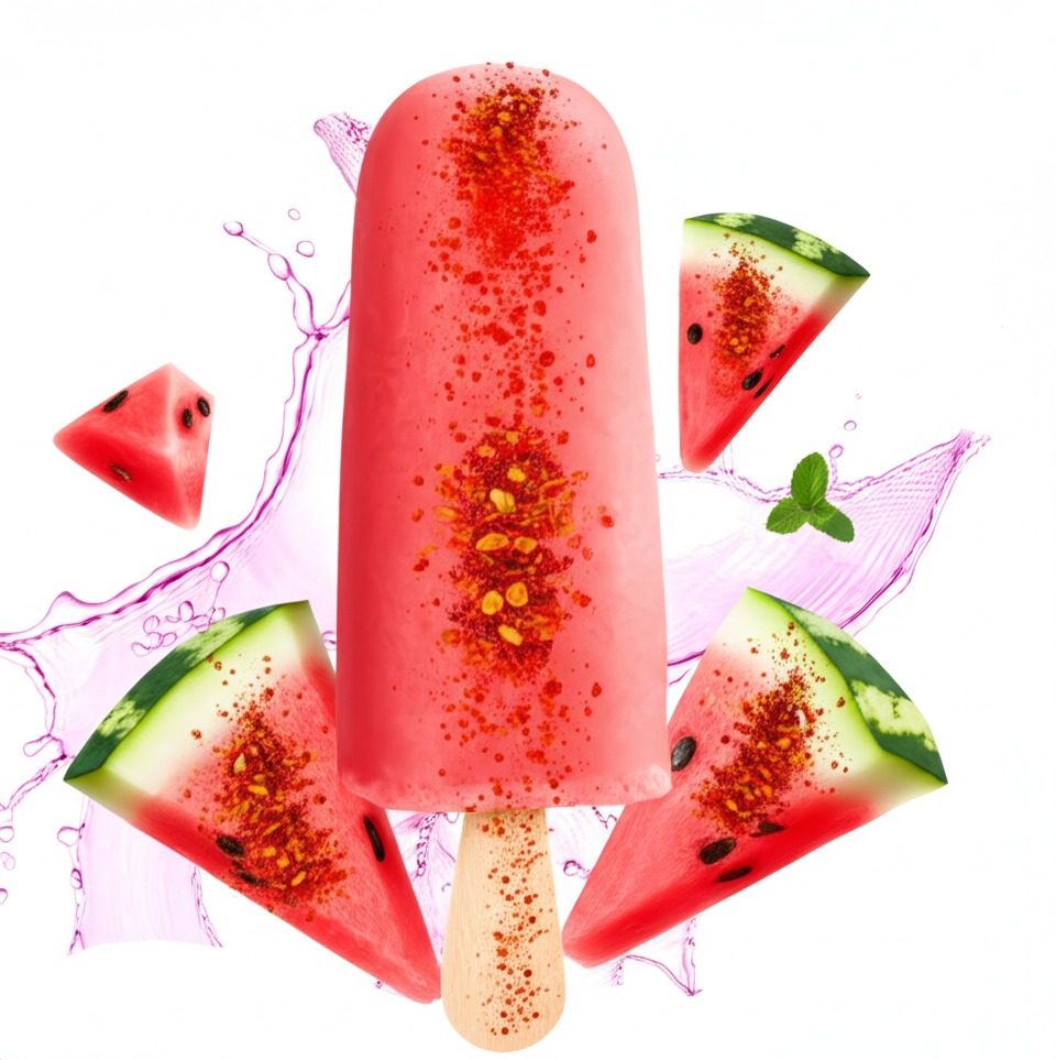 Sweet, hydrating watermelon meets a splash of chili spice in this vibrant popsicle—perfectly balanced for a fun and fruity treat with a little heat.